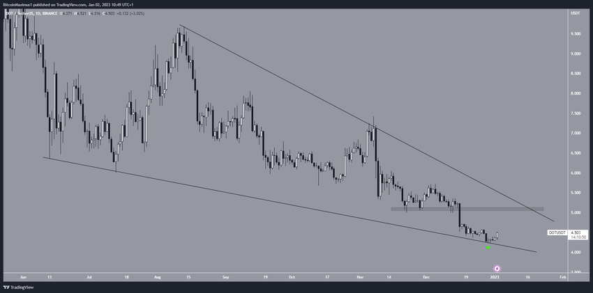 El precio de Polkadot ha caído dentro de una cuña descendente a largo plazo desde el 13 de junio. La caída llevó a un precio mínimo de 4.22 dólares el 29 de diciembre, antes de que se produjera un rebote.