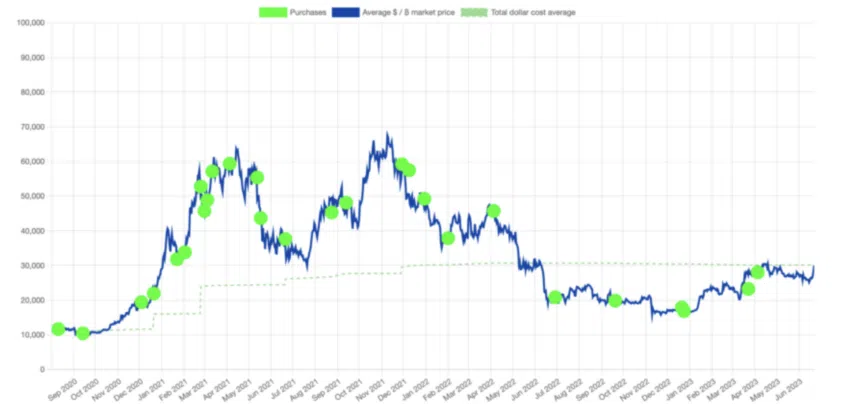 La firma compró 140,000 BTC a un precio promedio de 29,903 dólares por moneda. El valor de la inversión es de 4.17 mil millones de dólares.