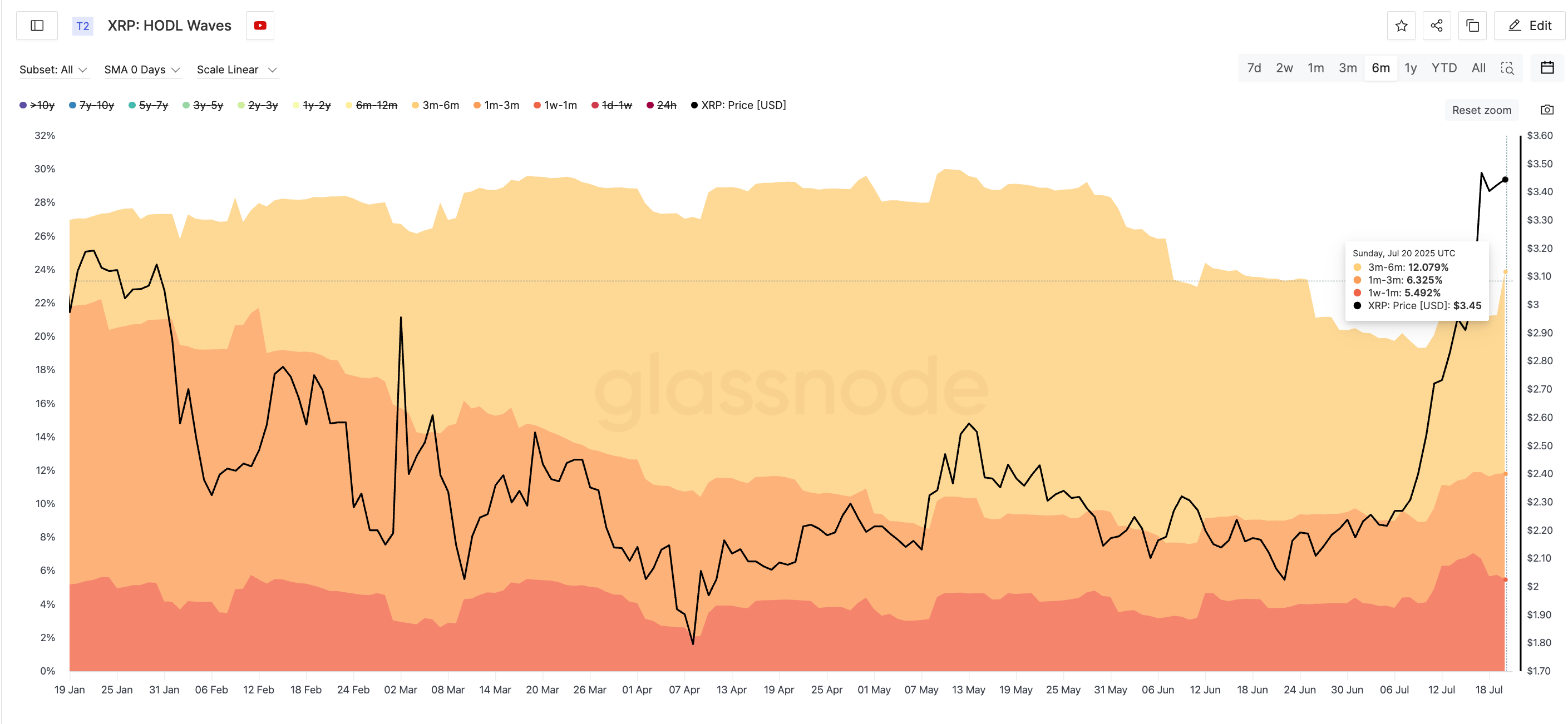 En paralelo, el indicadores HODL Waves señala un crecimiento en los monederos que han mantenido XRP entre una semana y seis meses. Específicamente, la banda de 3 a 6 meses creció del 10.4% al 12.08%, y los holders de 1 a 3 meses pasaron del 4.8% al 6.3%. Este incremento evidencia que los nuevos compradores están dispuestos a conservar el token, incluso en medio de picos de precio.
