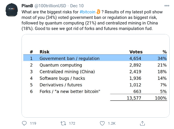 El autor de S2F de Plan B, un popular analista cripto, hizo una encuesta entre sus seguidores. La pregunta principal era sobre los riesgos con los que Bitcoin podría encontrarse.
