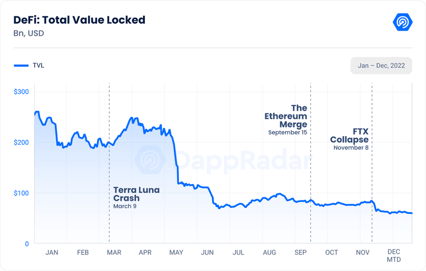 A pesar del éxito de estos protocolos, DeFi finalmente tuvo problemas en 2022, con una caída total de TVL desde un máximo de 211,4 mil millones de dólares en enero a 55 mil millones de dólares en diciembre, una pérdida del 73,97%.