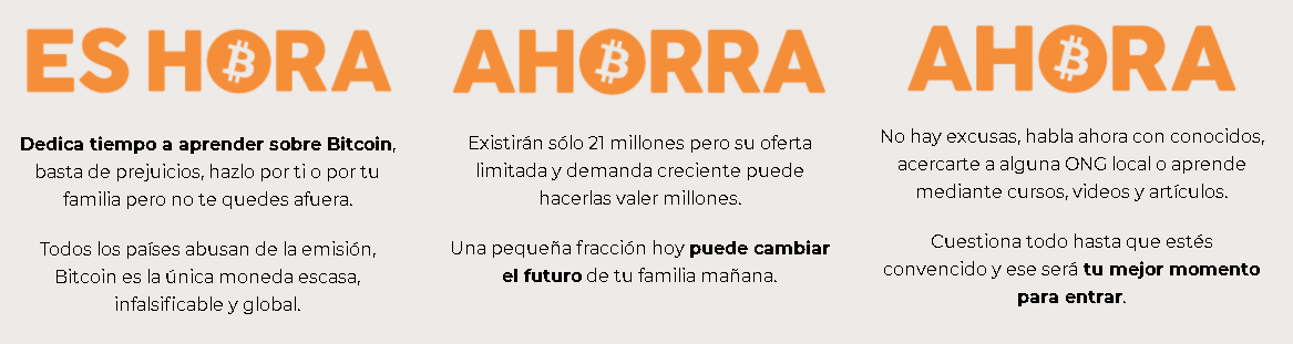 El sitio web incentiva al hashtag #eshoradebitcoin para su difusión en las distintas redes sociales. Además, cuenta con material educativo que redirige al trabajo de Estudio Bitcoin, en donde el artículo “Bitcoin: ¿qué, cómo y para qué?” de Franco Amati posee una mención especial.