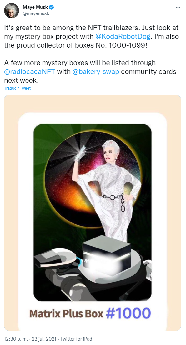 Maye Musk, conocida por ser la madre del multimillonario Elon Musk, lanzó en julio de este año su primera colección NFT en asociación con Radio Caca, llamada “Maye Musk Mystery Box”.