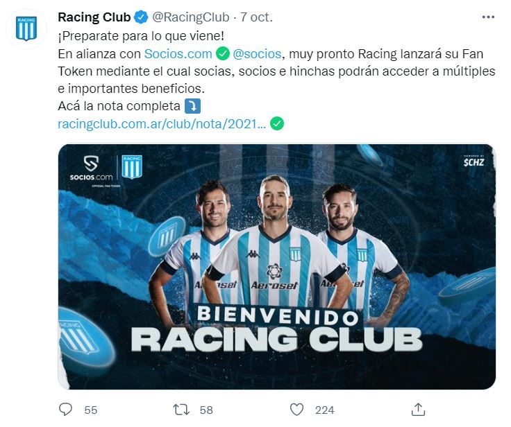 “Con la plataforma Socios.com ya trabajan gigantes del fútbol mundial como FC Barcelona, Paris Saint-Germain, Juventus, Manchester City, AC Milan, Arsenal o las selecciones nacionales de Argentina y Portugal y qué tienes que hacer para adquirir tu Fan Token oficial de Racing ($RACING) y disfrutar de todas las ventajas. Recuerda que si eres socio del club y estás al día en el pago de tu cuota tendrás uno completamente gratis”.