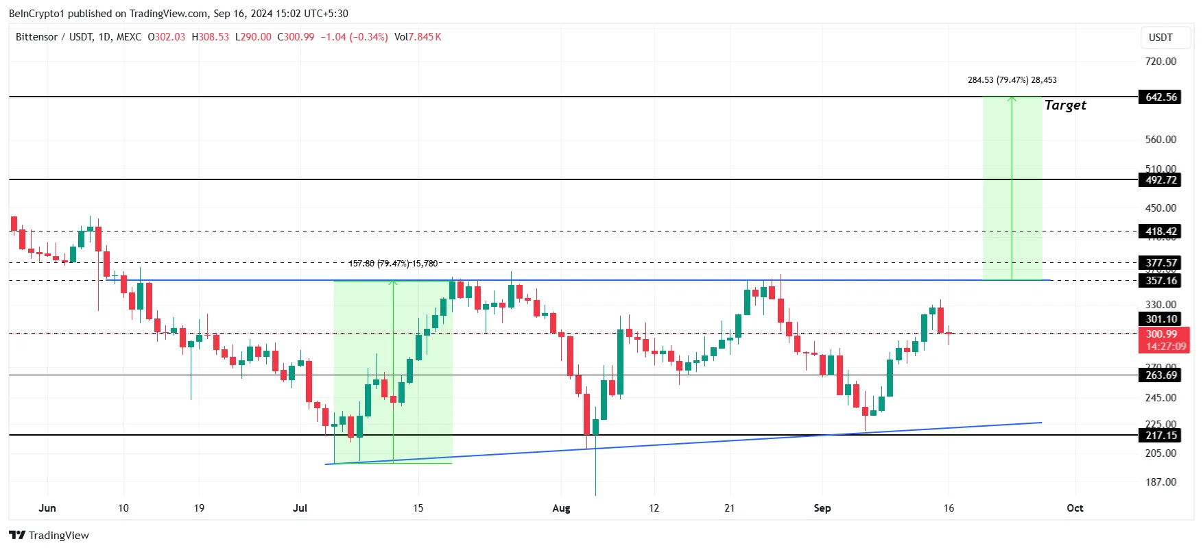 El precio de TAO está actualmente negociado a 300 dólares, ligeramente por debajo del crucial nivel de 301 dólares. Si la altcoin puede convertir este nivel en soporte, podría subir hacia 357 dólares y salir de su patrón de triángulo ascendente alcista. Lograr esto prepararía el escenario para mayores ganancias y validaría el escenario alcista.