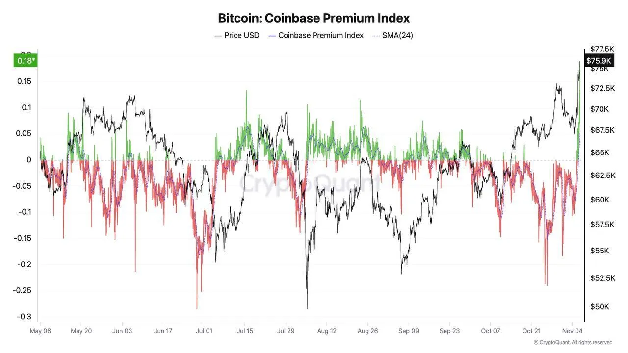 El precio de Bitcoin (BTC) ha alcanzado recientemente un nuevo máximo histórico tras la elección de Donald Trump como presidente de Estados Unidos. Este aumento en la demanda parece estar impulsado por un renovado interés de los inversores estadounidenses, como se observa en el significativo aumento del premium del precio de Bitcoin en Coinbase.