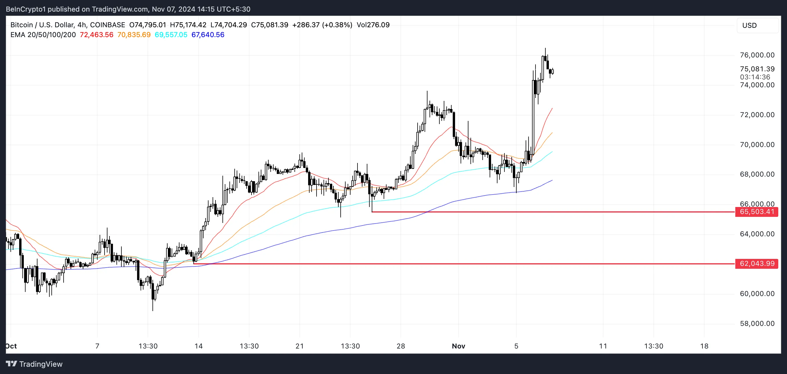 Las líneas EMA de Bitcoin actualmente muestran una configuración alcista. Incluso después de alcanzar un nuevo máximo histórico, el precio ha retrocedido ligeramente pero sigue siendo positivo. La EMA, o Media Móvil Exponencial, ayuda a suavizar los movimientos de precios e identificar tendencias. En este caso, la posición de estas líneas sugiere un continuo optimismo.