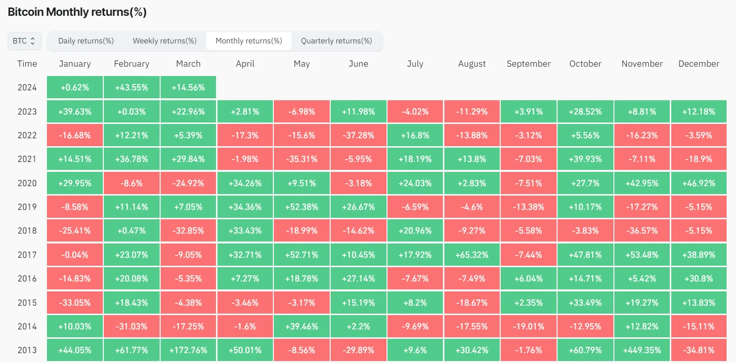 Desde septiembre de 2023, Bitcoin ha superado sistemáticamente las cifras del mes anterior, lo que indica una trayectoria ascendente sostenida. A medida que se acerca el final de marzo, con Bitcoin trading a 70,000 dólares, el mercado podría ser testigo de un séptimo mes alcista consecutivo para BTC.