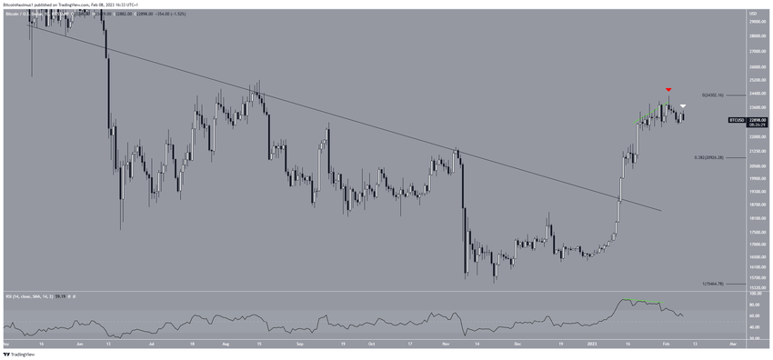 El precio de BTC ha aumentado a un ritmo acelerado desde principios de año. Salió de una línea de resistencia descendente el 13 de enero y alcanzó un máximo de 24,258 dólares el 2 de febrero. Sin embargo, creó una vela bajista (icono rojo) el mismo día y ha caído desde entonces.