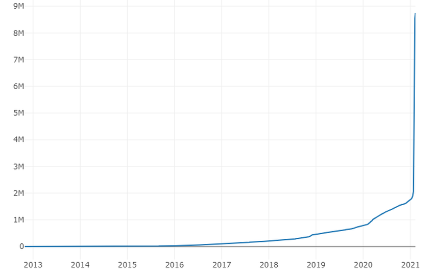 A fines de diciembre de 2020, Dogecoin se cotizaba por solo 0.004 dólares. Solo un mes después, cada token se cotiza por alrededor de 0.08 dólares. Eso representa una apreciación de casi el 2,000%, lo que es prácticamente inaudito incluso en los volátiles mercados cripto.