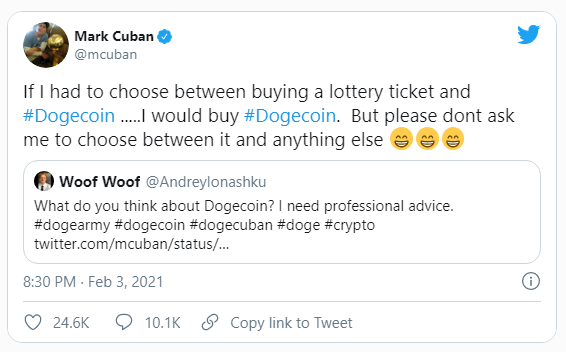 Musk no es el único multimillonario de alto perfil que ha hablado favorablemente sobre Dogecoin últimamente. Mark Cuban, famoso empresario tecnológico, dijo que elegiría Dogecoin en lugar de un billete de lotería.