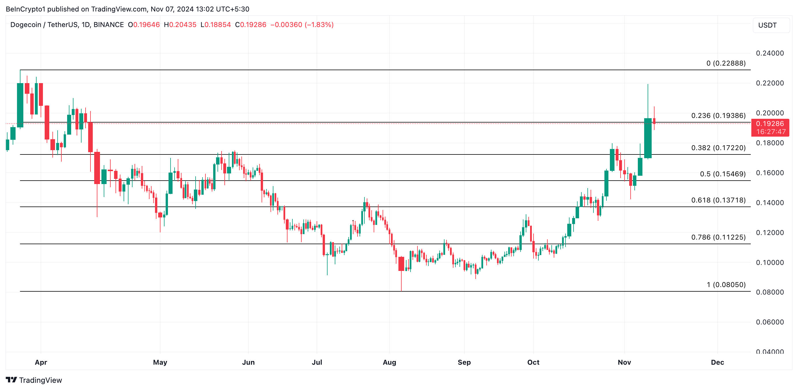 El rally del mercado de criptomonedas del miércoles, tras la victoria de Donald Trump en las elecciones de EE.UU. de 2024, desencadenó un salto de dos dígitos en el precio de Dogecoin. La memecoin se disparó un 25% en una sola sesión de trading, alcanzando un máximo mensual de 0.211 dólares.