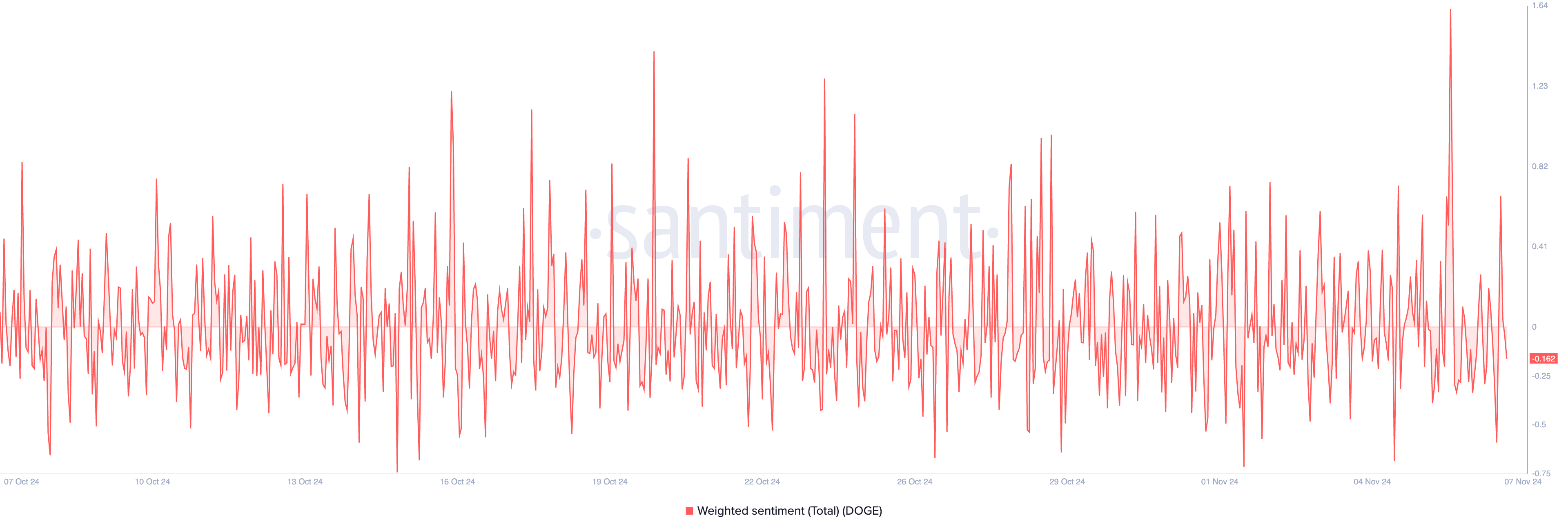 Además, el sentimiento general del mercado hacia Dogecoin no inspira confianza. En este momento, su sentimiento ponderado es de -0.16.