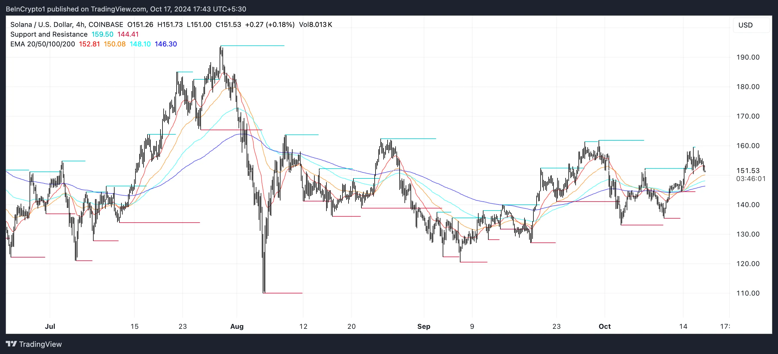 Las líneas EMA de SOL siguen siendo alcistas, con medias móviles exponenciales a corto plazo (EMA) posicionadas por encima de las EMA a largo plazo. Esta disposición sugiere que la tendencia del precio está actualmente en una fase ascendente, con movimientos de precio recientes superando el promedio a largo plazo. Sin embargo, las EMA a corto plazo están comenzando a tender hacia abajo, indicando una posible pérdida de impulso.