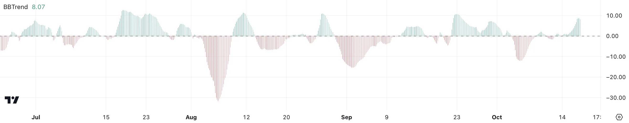 Un BBTrend positivo a menudo sugiere que la tendencia del precio está bien respaldada, y el activo podría continuar su trayectoria ascendente. Sin embargo, el BBTrend por sí solo debe complementarse con otros indicadores para confirmar la fuerza y sostenibilidad general de la tendencia.