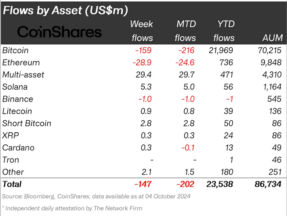 Según un informe reciente de CoinShares, para la semana que terminó el 4 de octubre, SOL vio entradas que totalizaron 5,3 millones de dólares. Esta cifra destaca mientras Bitcoin y Ethereum experimentaron salidas significativas durante el mismo período, resaltando el fuerte atractivo de SOL.