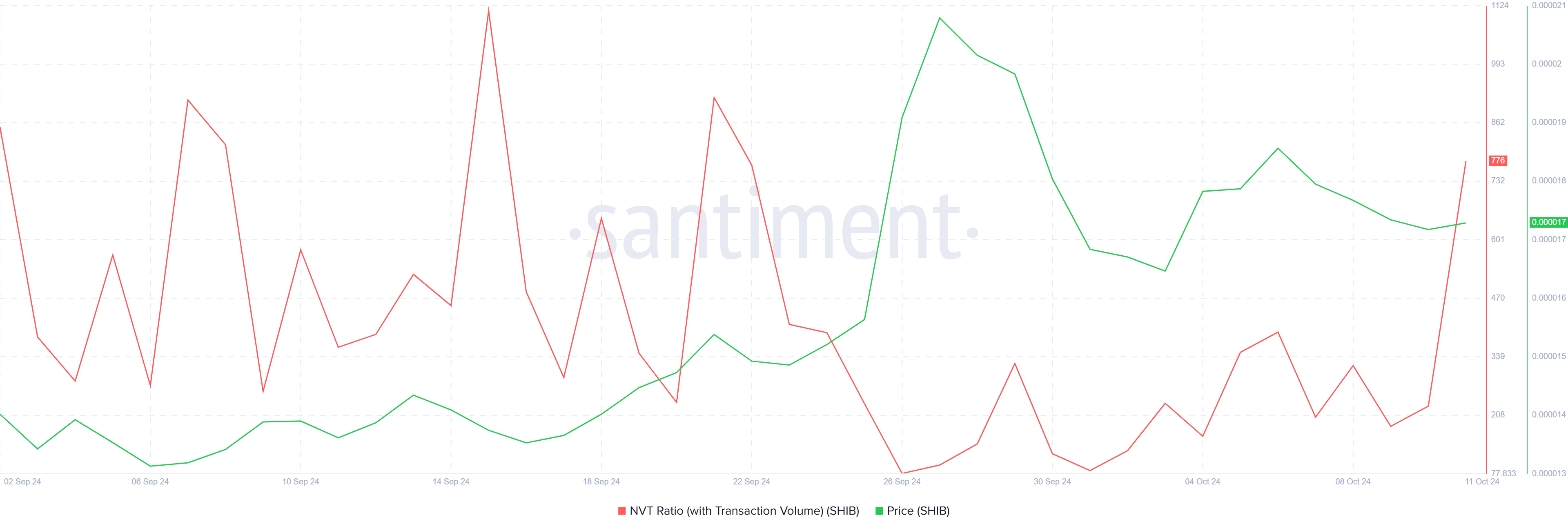 A pesar del sentimiento positivo, el impulso macro de Shiba Inu presenta una perspectiva más cautelosa. La relación Network Value to Transactions (NVT) muestra que SHIB podría estar sobrevalorado en sus niveles actuales.