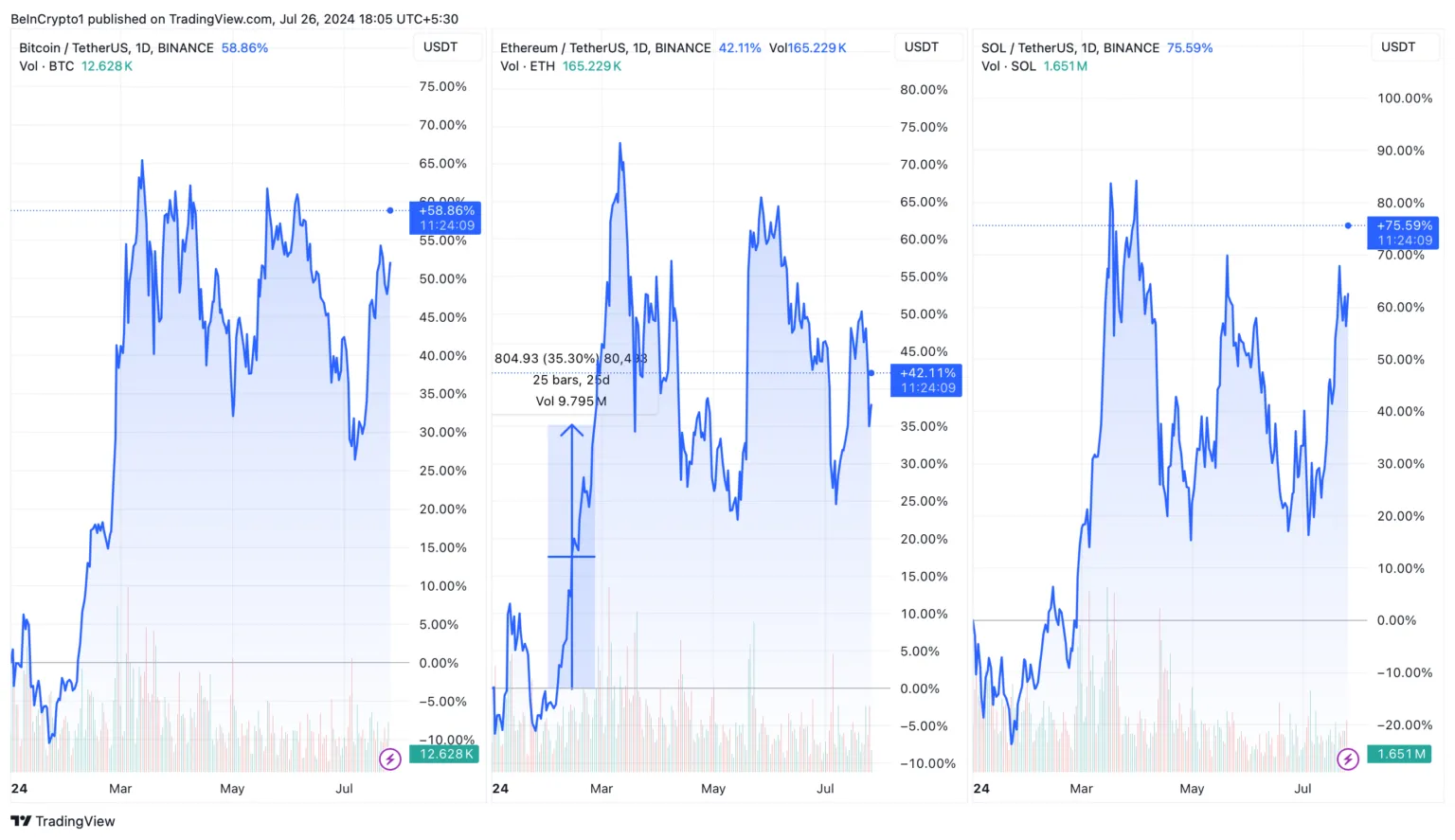 El impresionante rendimiento de mercado de Solana respalda la perspectiva optimista de Pal. Hasta la fecha, Solana ha aumentado aproximadamente 75%, superando tanto a Bitcoin como a Ethereum (ETH), que registraron ganancias del 58% y 42%, respectivamente.