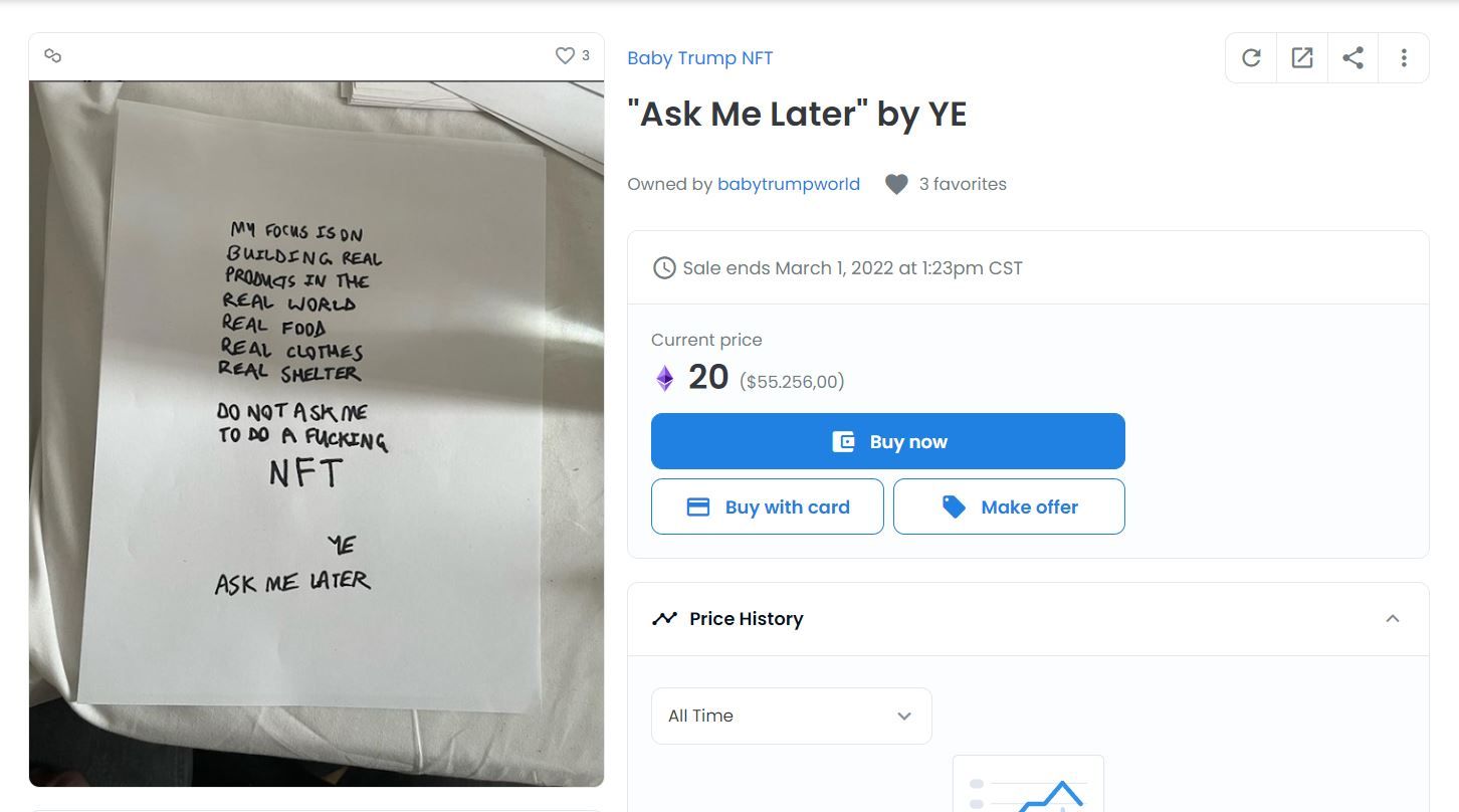 Aunque descartó pensar en diseñar o lanzar alguna pieza o colección NFT, no negó la oportunidad de realizarlo en un futuro, e incluso mencionó que le “pregunten después”. Además, su hoja fue puesta a la venta como un NFT en OpenSea, cuya puja termina el 1 de marzo y hasta el momento cuesta 20 ETH (55,256 dólares), es decir, la hoja donde Kanye West o Ye rechaza los NFT tiene un costo.