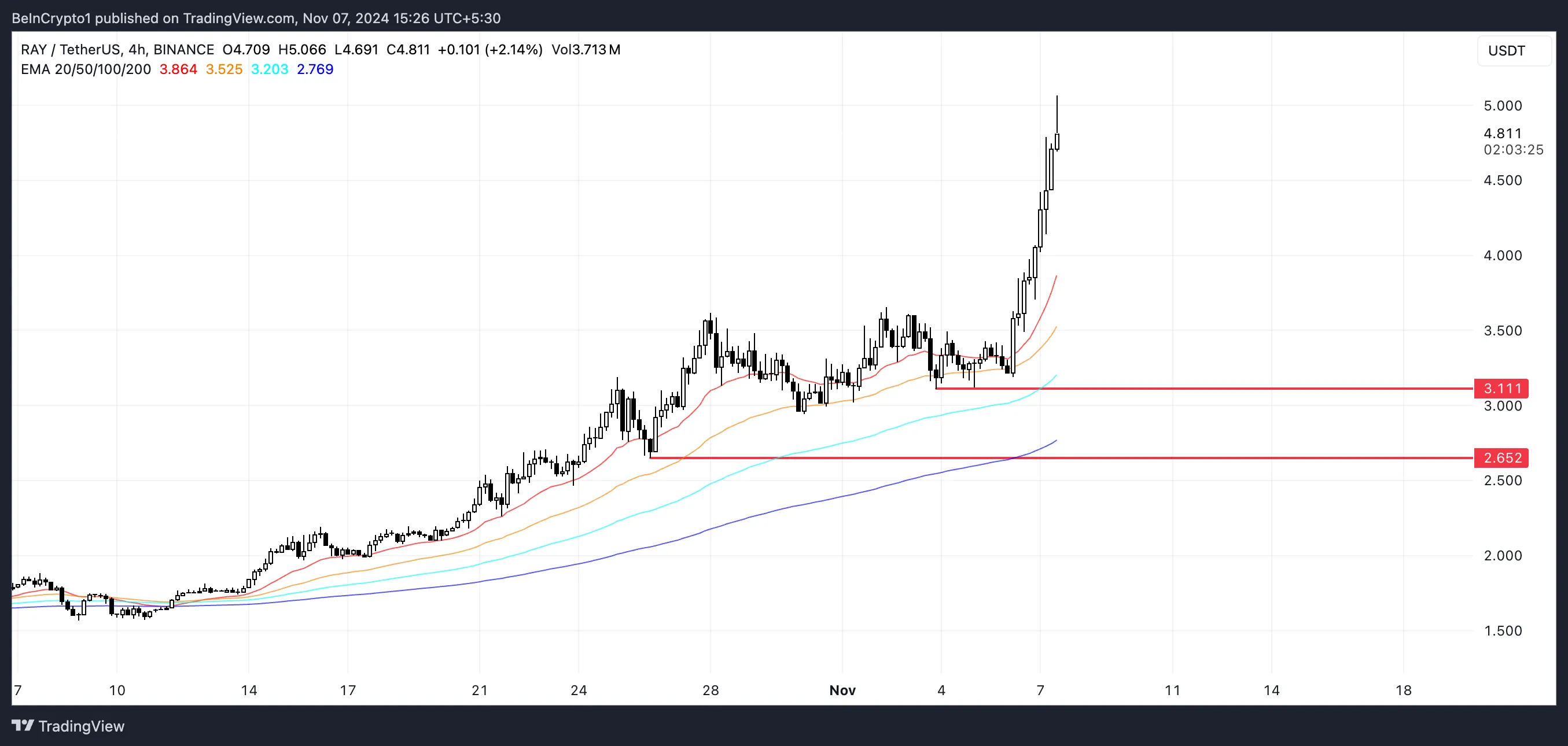 Las líneas EMA para RAY están mostrando una configuración alcista, con las EMA a corto plazo posicionadas por encima de las de largo plazo y manteniendo una distancia saludable entre ellas. Esto sugiere que actualmente hay una fuerte tendencia alcista en juego. Si la tendencia alcista persiste y el RSI se mantiene estable sin un retroceso, RAY podría superar el nivel de 5 dólares y continuar ascendiendo.