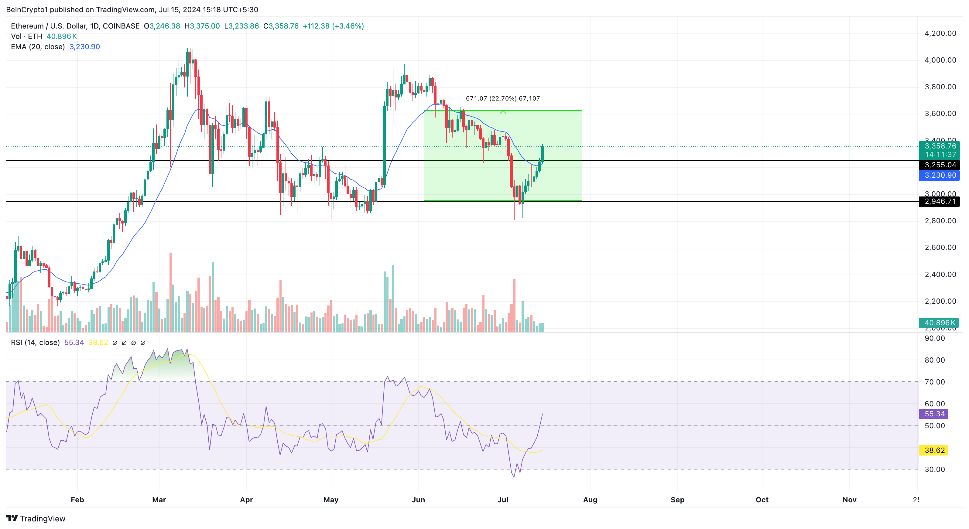 En el momento de la publicación, ETH se negocia a 3,360 dólares. El precio también está cotizando por encima de la EMA de 20 días (azul). EMA es un acrónimo de Media Móvil Exponencial, y mide los cambios en la dirección del precio durante un período de tiempo.