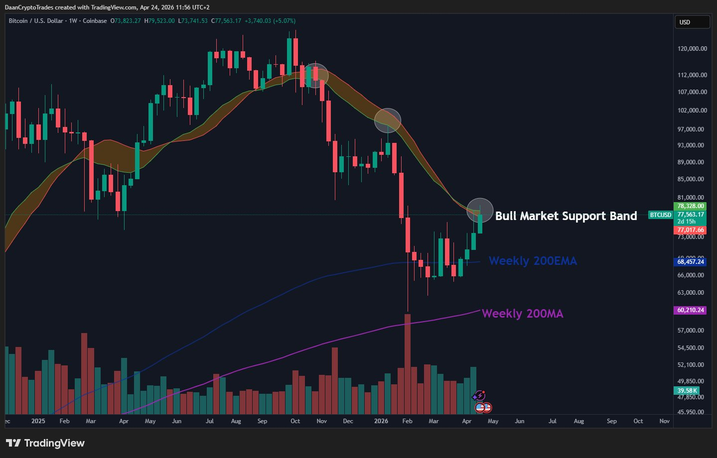 “$BTC Con su tercer intento de retomar la banda de soporte del mercado alcista durante esta tendencia bajista. Un cierre semanal por encima podría confirmar el fin de esta tendencia bajista y un rebote de alivio adicional. Pero por ahora, el precio parece estar rechazando ligeramente. ¡Interesante cierre semanal por venir!”, destacó el criptoanalista Daan Crypto Trades en X.