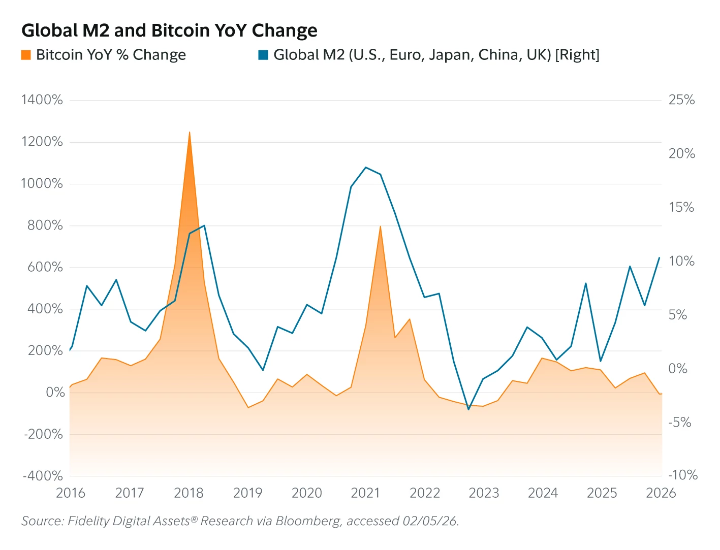El tercer vector que condiciona el precio es la liquidez global. Fidelity Digital Assets ha documentado una correlación significativa de largo plazo entre Bitcoin y la expansión del agregado monetario Global M2, aunque advierte contra lecturas causales automáticas.