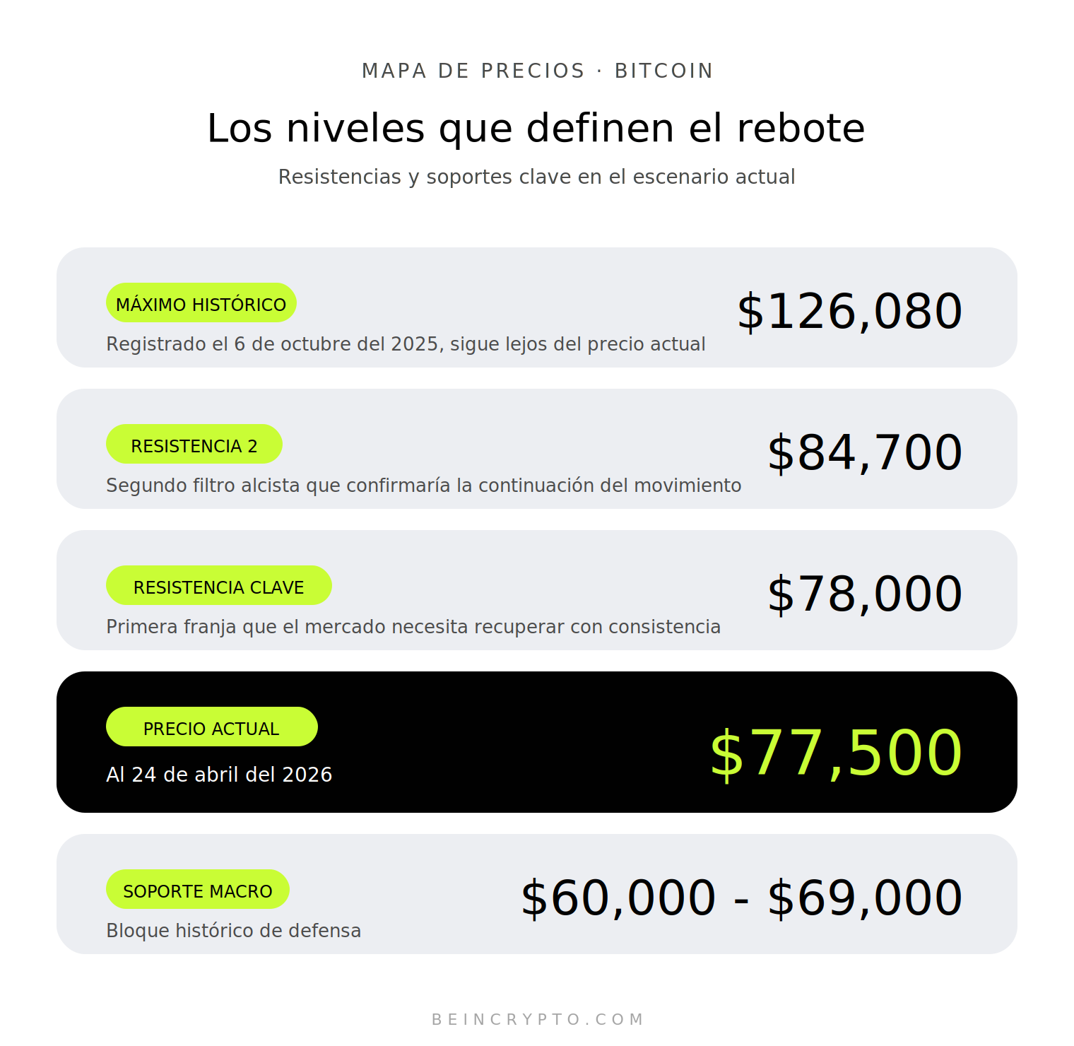 - Bitcoin cotiza en 77,500 dólares al 24 de abril de 2026, todavía muy por debajo del máximo histórico de 126,080 dólares registrado en octubre.