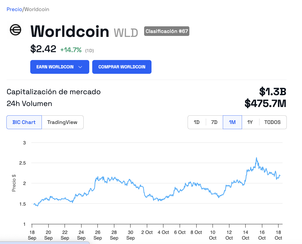 El 18 de octubre, el precio de Worldcoin (WLD) cotizaba en 2,39 dólares, con una ganancia de 12,95%. Ello, tras su último anuncio de nuevos planes y rebranding. En la última semana, el token ha ganado un 23,40%, en el mes, 58,49%, mientras que su capitalización de mercado opera con ganancias de 13,42% para situarse en 1,30 mil millones de dólares.