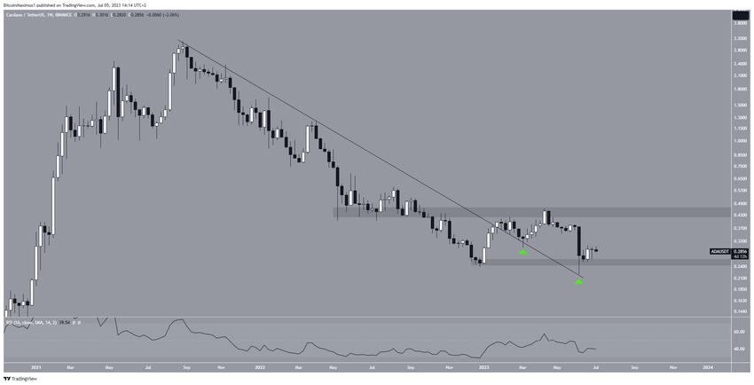 El análisis técnico de ADA para el marco de tiempo semanal muestra que el precio de Cardano rompió una línea de resistencia descendente a largo plazo a principios de enero.