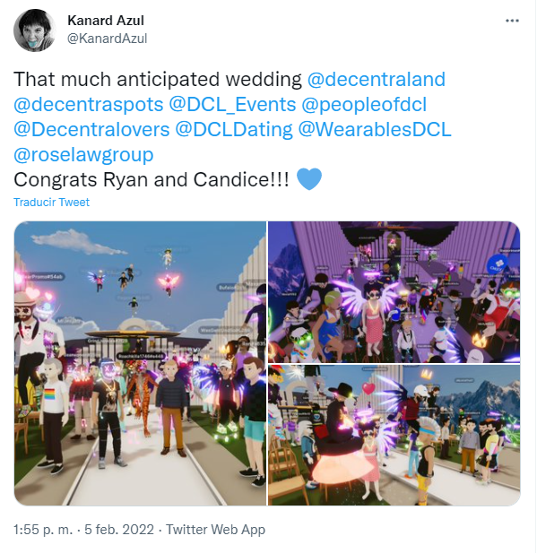 La boda tuvo lugar el 4 de febrero en el metaverso de realidad virtual Decentraland basado en el navegador. Un usuario de Twitter que se hace llamar @KanardAzul compartió algunas fotos de “esa boda tan esperada”.