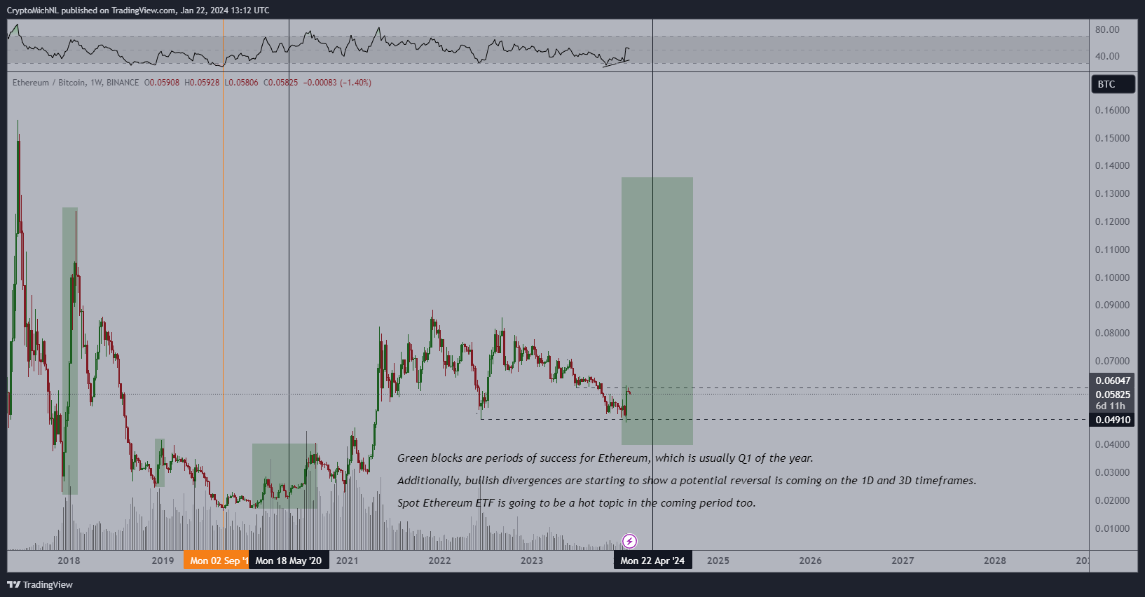 Según el analista, ETH/BTC actualmente muestra una “divergencia alcista” en el gráfico semanal. Esto indica que se avecinan varias semanas positivas para Ethereum en relación con Bitcoin: