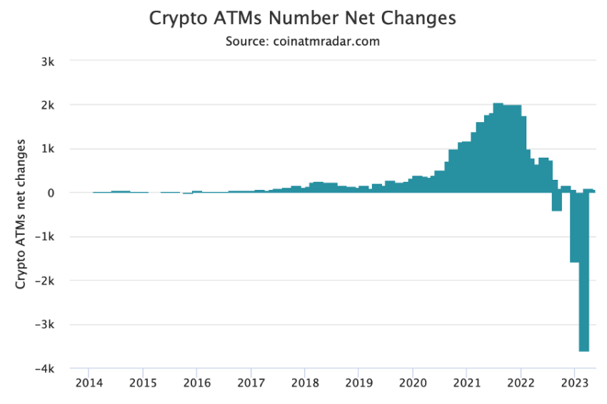 Con 3,627 cajeros automáticos cripto cayendo el mes pasado, como es evidente en el gráfico anterior. Marzo de 2023 se convierte en el mes con la mayor caída mensual de cajeros automáticos cripto.