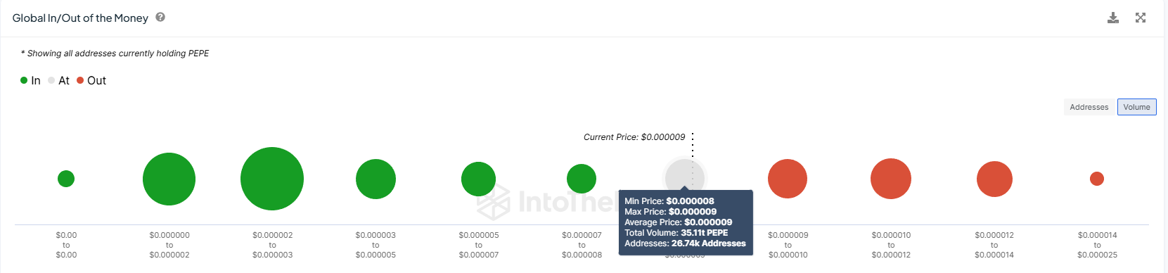 Según el indicador Global In/Out of the Money (GIOM), se compraron aproximadamente 70 billones de PEPE por más de 617 millones de dólares entre 0.00000800 dólares y 0.00000990 dólares. Este suministro solo será rentable una vez que el precio de PEPE establezca 0.00001000 dólares como piso de soporte.