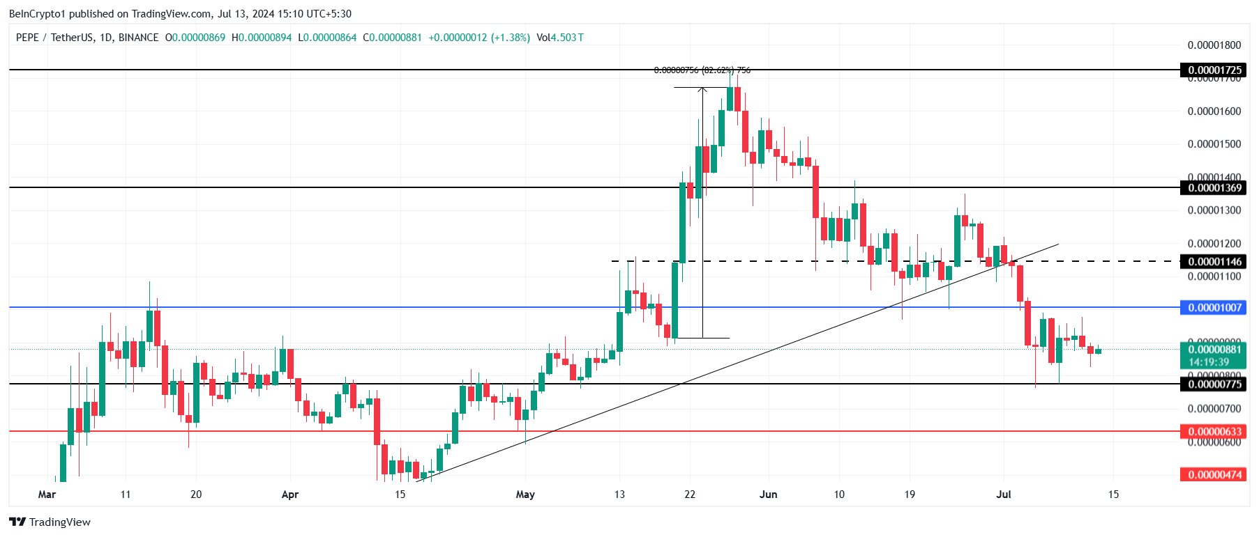 El precio de PEPE a 0.00000881 dólares está por debajo de 0.00001000 dólares y espera un detonante alcista para iniciar un rally. Esto beneficiaría a los inversores ya que sus ganancias permanecen en el limbo debido a la consolidación del memecoin.