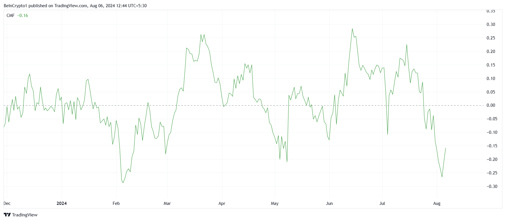 Esto se debe a que los inversores están impulsando el rally para recuperar lo que perdieron. Los datos del Chaikin Money Flow (CMF) de Toncoin indican que la altcoin experimentó las mayores salidas en seis meses. Este período de salidas significativas refleja una notable disminución en la presión de compra y el sentimiento de los inversores.