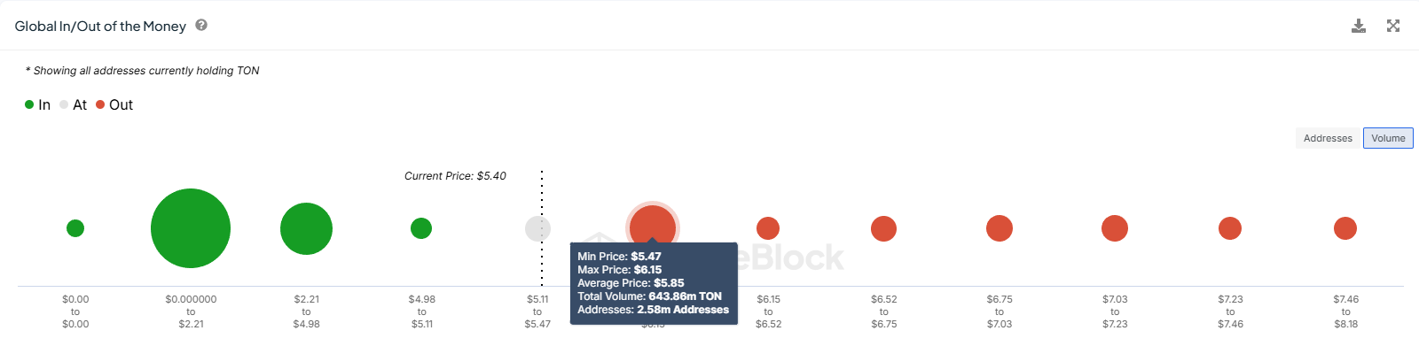 Según el indicador Global In/Out of the Money (GIOM), aproximadamente 643,86 millones de TON valorados en más de 3,55 mil millones de dólares están esperando ganancias. Este suministro fue comprado entre 5.47 dólares y 6.15 dólares y podría estar viendo ganancias pronto.