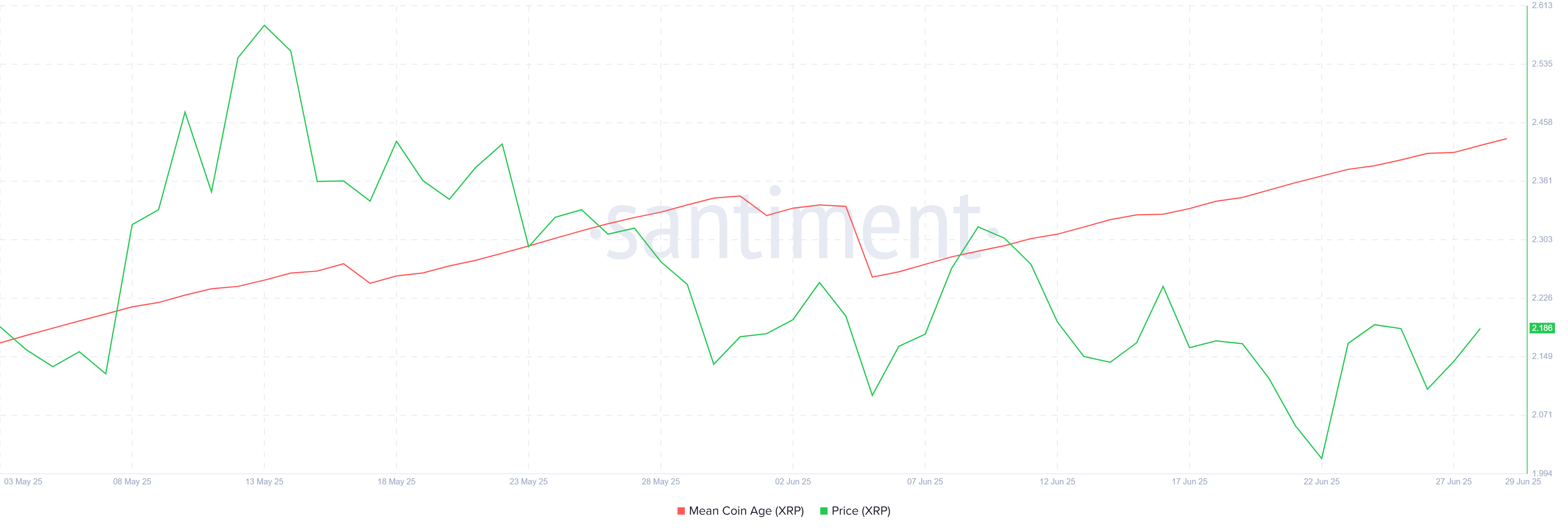 Observando el macro momentum, la Mean Coin Age (MCA) ha mostrado un aumento constante a lo largo de este mes. La MCA refleja el comportamiento de los holders a largo plazo (LTH), y su aumento indica que los LTH están eligiendo acumular XRP en lugar de vender.
