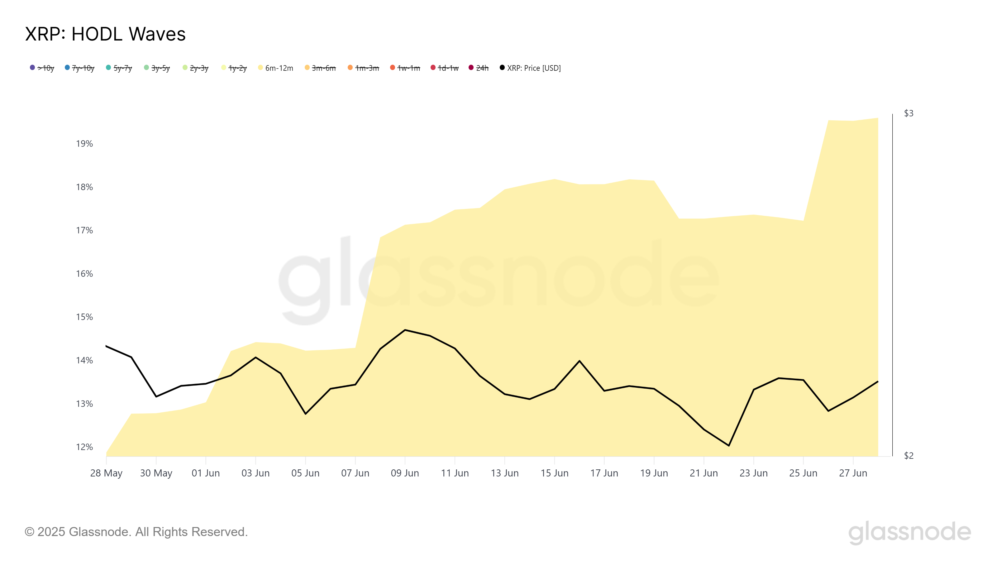 Las direcciones que han mantenido XRP durante más de 6 a 12 meses han experimentado un aumento notable en concentración este mes, aumentando un 12.8% a 19.1%. Este aumento en holders a medio plazo indica un fuerte nivel de convicción en el futuro del activo.