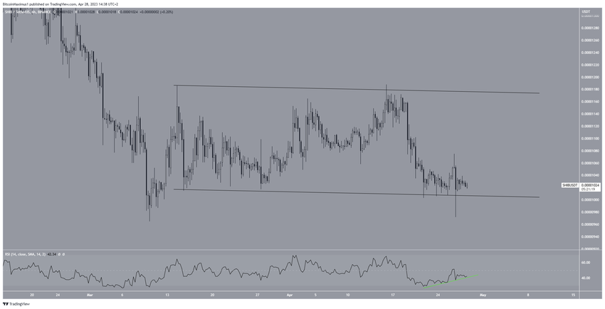 Si bien el hecho de que SHIB opere en la parte inferior del canal es bajista, el RSI es alcista. El indicador ha generado divergencia alcista (línea verde).