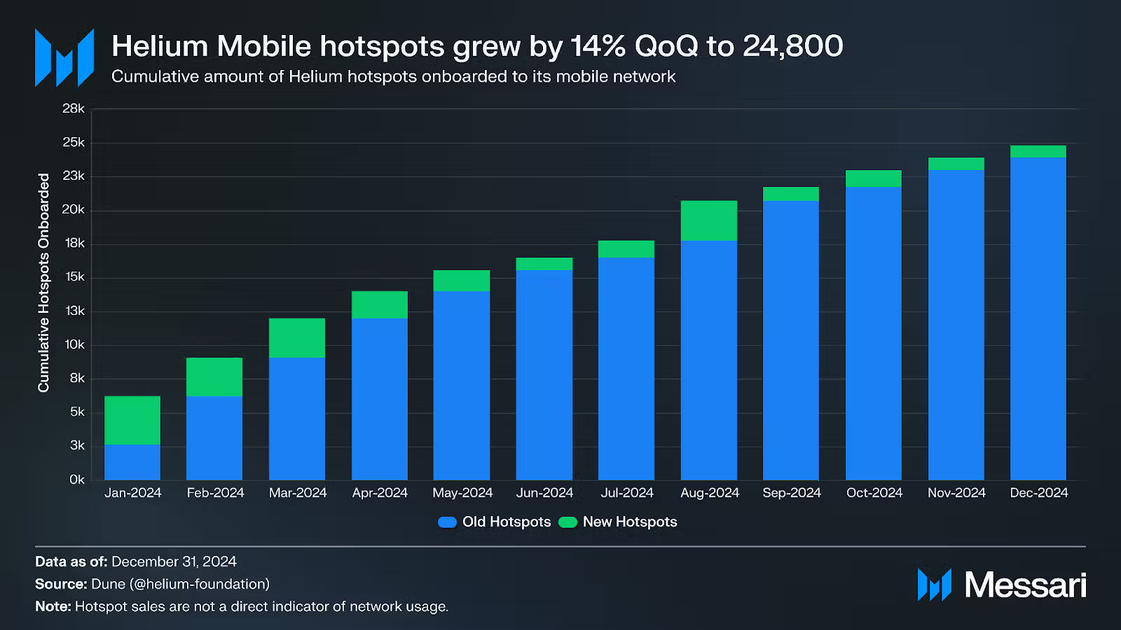 Por otra parte, Messari reportó que el programa de descarga de operadores de Helium se posicionó como “un disruptor potencial” en la industria de telecomunicaciones tradicionales. En el cuartro trimestre de 2024, más de 124,000 usuarios se suscribieron a Helium Mobile para utilizar sus servicios de “conversaciones y mensajes de texto ilimitados”.