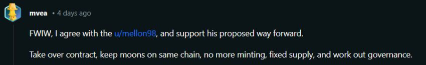 Los miembros del subreddit r/CryptoCurrency intercambiaron ideas sobre el futuro del token MOON. Uno de los usuarios con el sobrenombre de u/mellon98 sugiere pedirle al equipo de Reddit que transfiera la propiedad del contrato a la comunidad cripto.