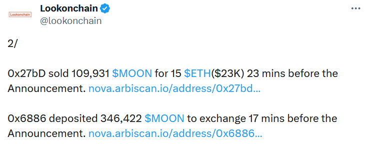 Aproximadamente 30 minutos antes del anuncio, dos moderadores de r/CryptoCurrency vendieron 456,353 tokens MOON. En aquel momento costaban en total unos 92.000 dólares, y los analistas de Lookonchain fueron los primeros en darse cuenta de ello. Otro gran tramo de 363.227 MOON entró en el mercado dos minutos antes del anuncio del equipo.
