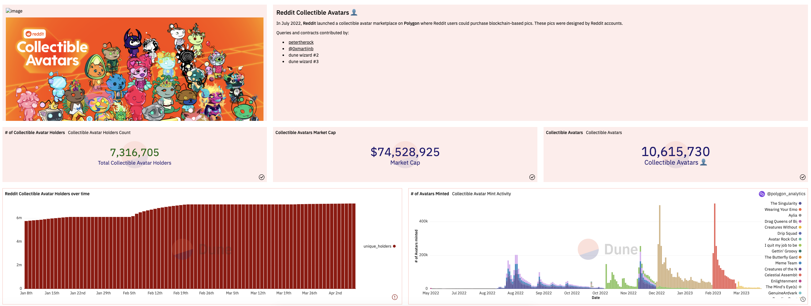 SponsoredSegún el panel de Dune Analytics, hay más de 10,6 millones de avatares coleccionables distintos y más de 7,3 millones de poseedores de avatares de Reddit. La capitalización de mercado de la colección es cercana a los 74,5 millones de dólares.