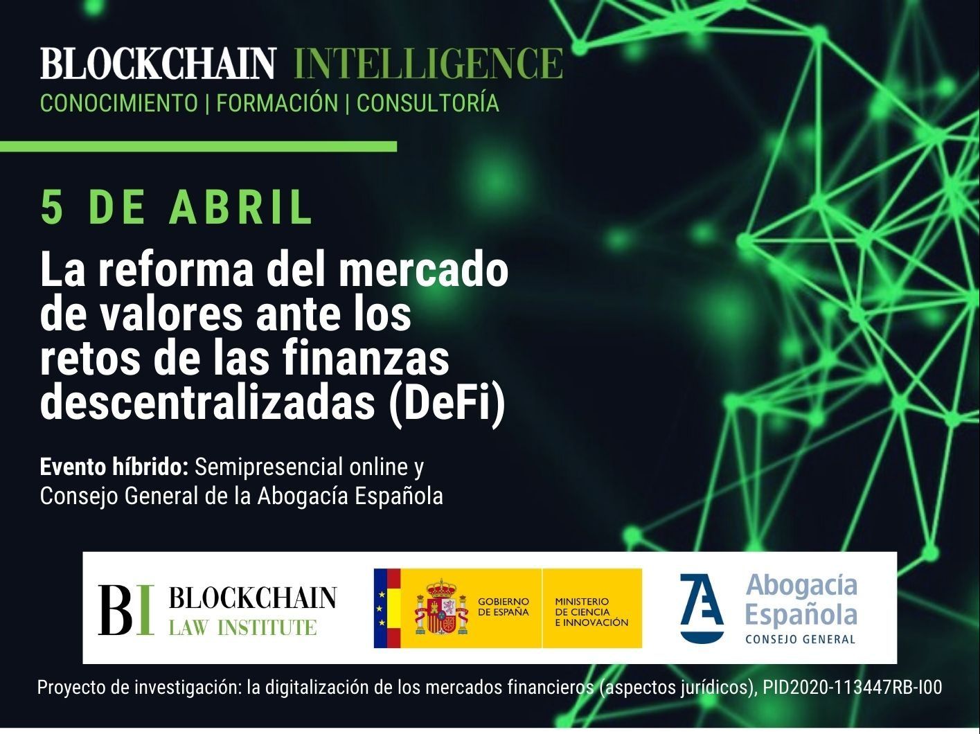 La consultora y plataforma de formación jurídica Blockchain Intelligence realizará su foro “La reforma del mercado de valores ante los retos de las finanzas descentralizadas (DeFi)” el 5 de abril, en conjunto con el Ministerio de Ciencia e Innovación del Gobierno de España y el Consejo General de la Abogacía Española.