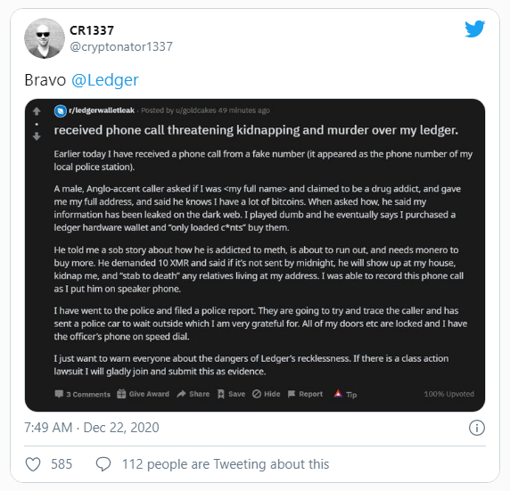 Para algunos, los ataques han sido aún peores. Según una publicación de Reddit, una víctima fue llamada y amenazada físicamente por el atacante que sabía que tenía un dispositivo Ledger.