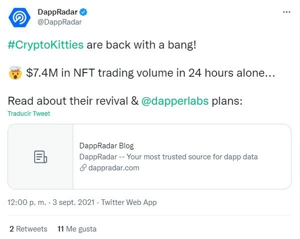 De acuerdo a un tweet publicado por DappRadar el viernes 3 de septiembre: