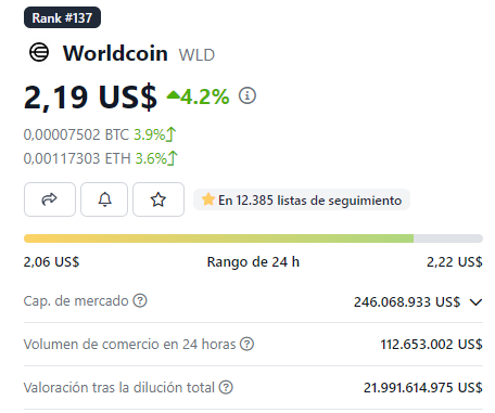 BeInCrypto ha hecho un seguimiento de los primeros movimientos del token de Worldcoin, que tuvo una caída del 40 % en su valor. Ha llegado a los dos dólares por token, tras haber alcanzado los 3.2 en su lanzamiento. Al momento de esta redacción, y con la divulgación de los controles mencionados, WLD se observaba ligeramente por encima de los 2 dólares.