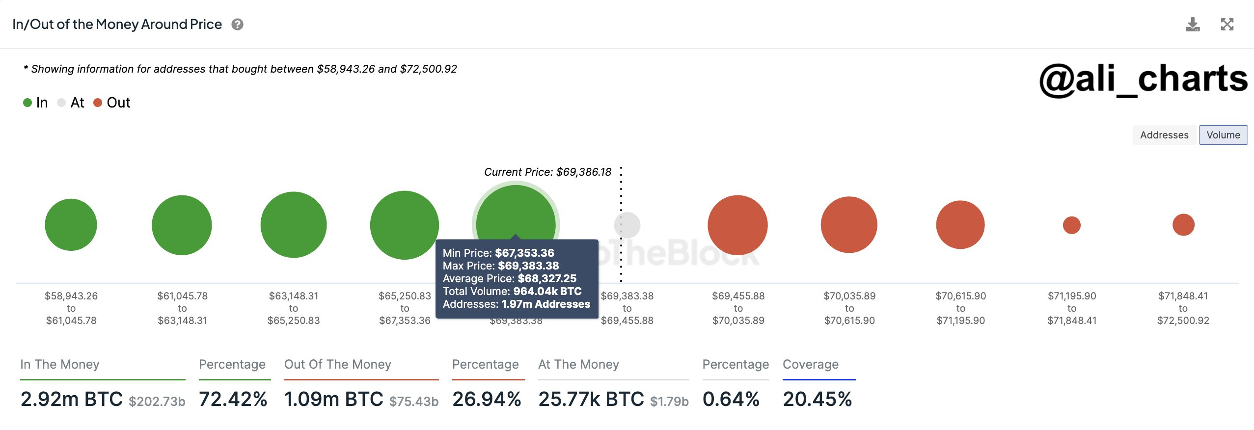SponsoredPor otra parte, el analista on-chain y jefe global de noticias de BeInCrypto, Ali Martínez, expuso que Bitcoin está anclado en una fuerte zona de soporte entre 69,380 dólares y 67,350 dólares.