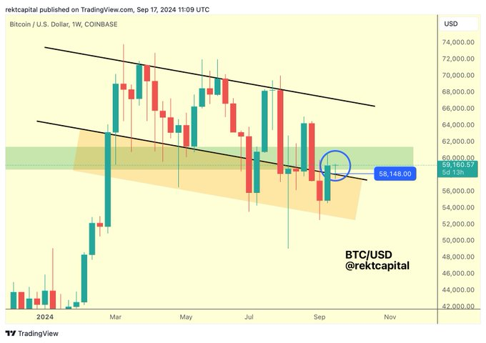 “Esta semana, este máximo inferior representa el precio de ~$61900. Si se rompe esta tendencia bajista, Bitcoin se recuperará hasta la parte superior de este canal bajista negro”, señaló el analista.